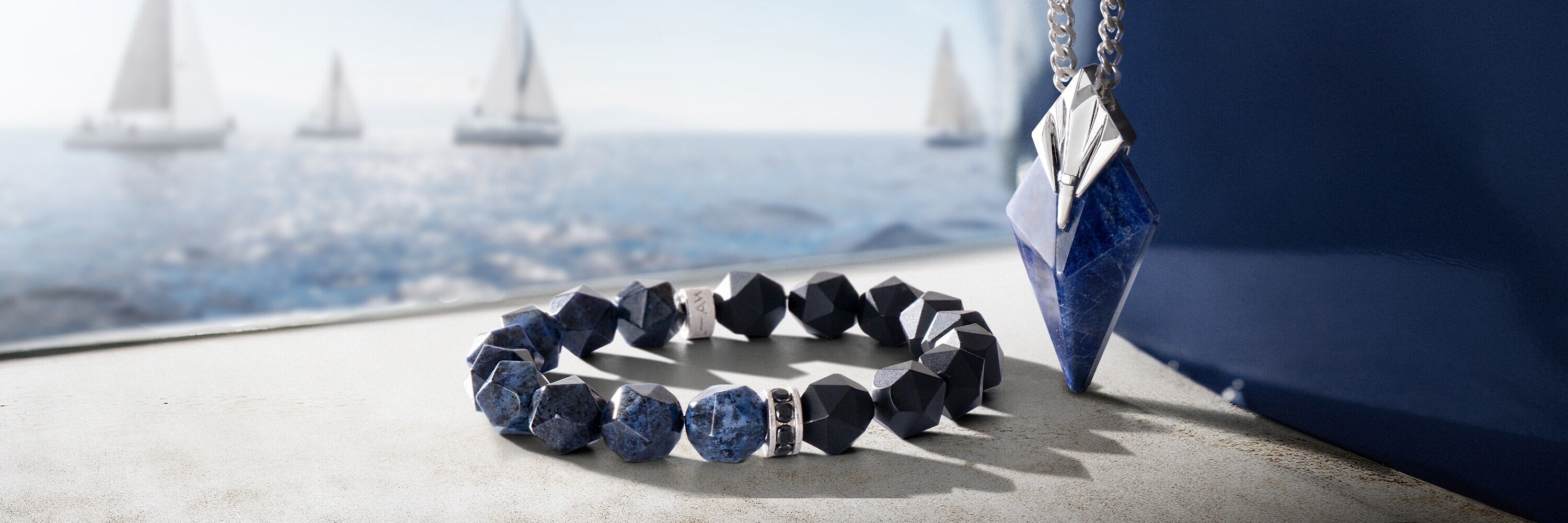 Dive into Poseidon's Whispers collection, a symphony of dumortierite, sodalite, and black onyx. These pieces, inspired by the profound depths of the ocean, channel Poseidon's might, empowering you to navigate life's currents with resilience and grace.