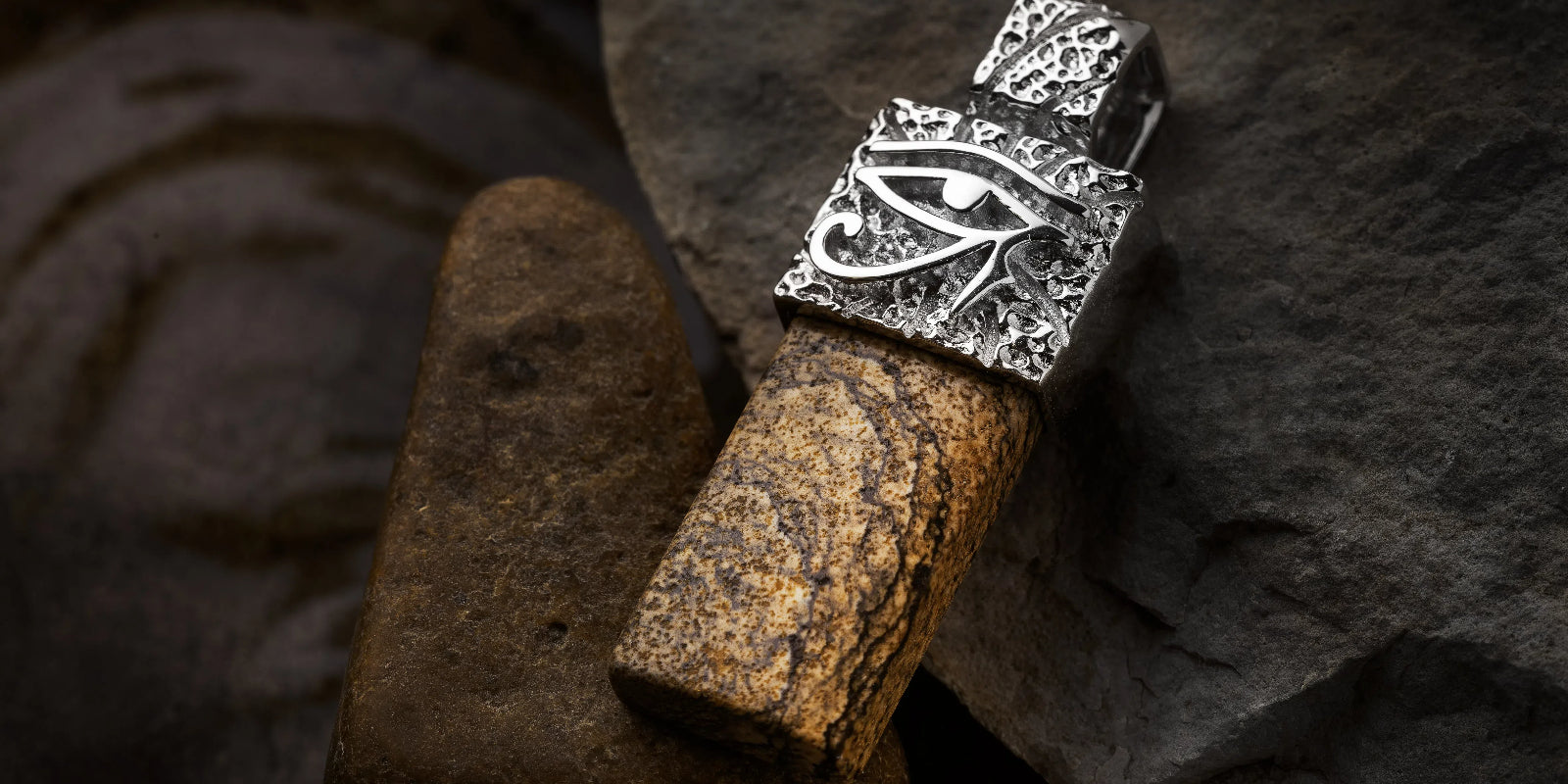 South African Picture Jasper cuboid (24 × 12.6 × 5mm) crowned with the Eye of Horus in 925 sterling silver, 18K white gold plated.Untreated natural stone—each pendant displays unique geological striations.