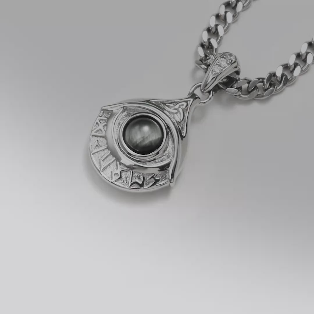 This necklace combines grey hawk’s eye stone with Celtic-inspired detailing and an eye-shaped form—a design that represents clarity and quiet strength.