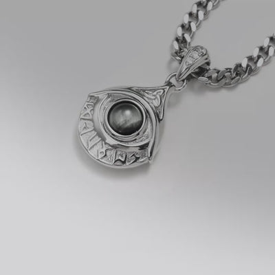 The central stone rotates within its frame, catching light from every angle. Engraved Nordic runes add meaning—signs of success, balance, and steady growth.