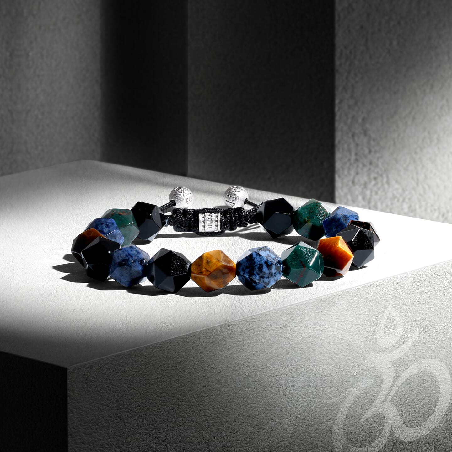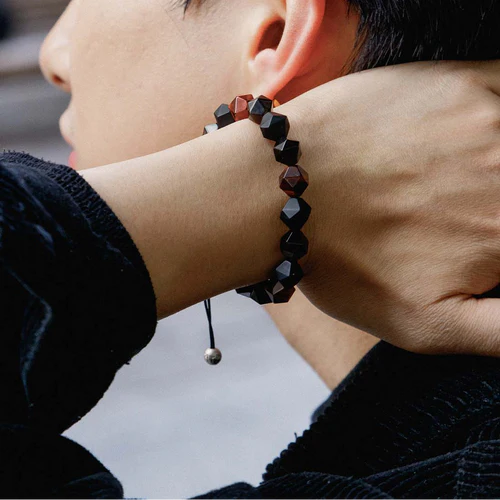 Black onyx’s steadiness, red tiger’s eye’s passion, and silver obsidian’s mystery: three energies unite, their faceted star cuts radiating a starlit glow, created for the strong.