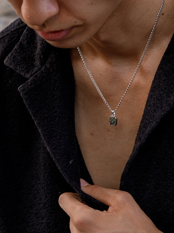 Framed in silver with a curb chain, it offers steady shine, design, and comfort.