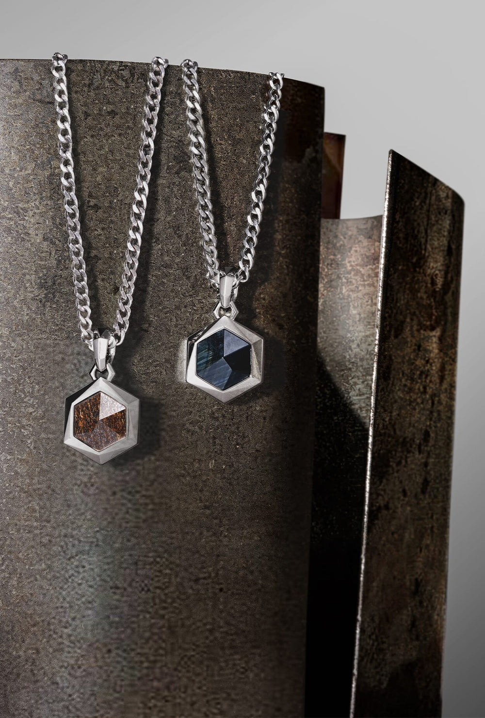 Cut from South African hawk’s eye, the stone reveals its natural chatoyancy—bands of light shifting across a deep blue surface. The hexagonal form is precision-shaped and set in sterling silver with 18k white gold plating. At 10.6g, it carries a balanced weight, combining geological character with considered craftsmanship.