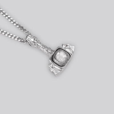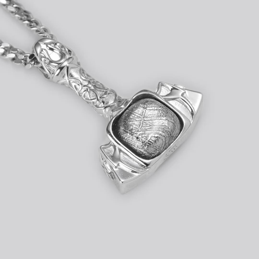 Cast as a single silver form, the pendant carries weight you notice immediately. The handle displays Celtic knotwork in relief, whilst the hammer head's flanks show angular geometric patterns—both requiring careful mould work to preserve detail. The meteorite sits secured through drilling and welding, a method that holds firmly without visible fixings.