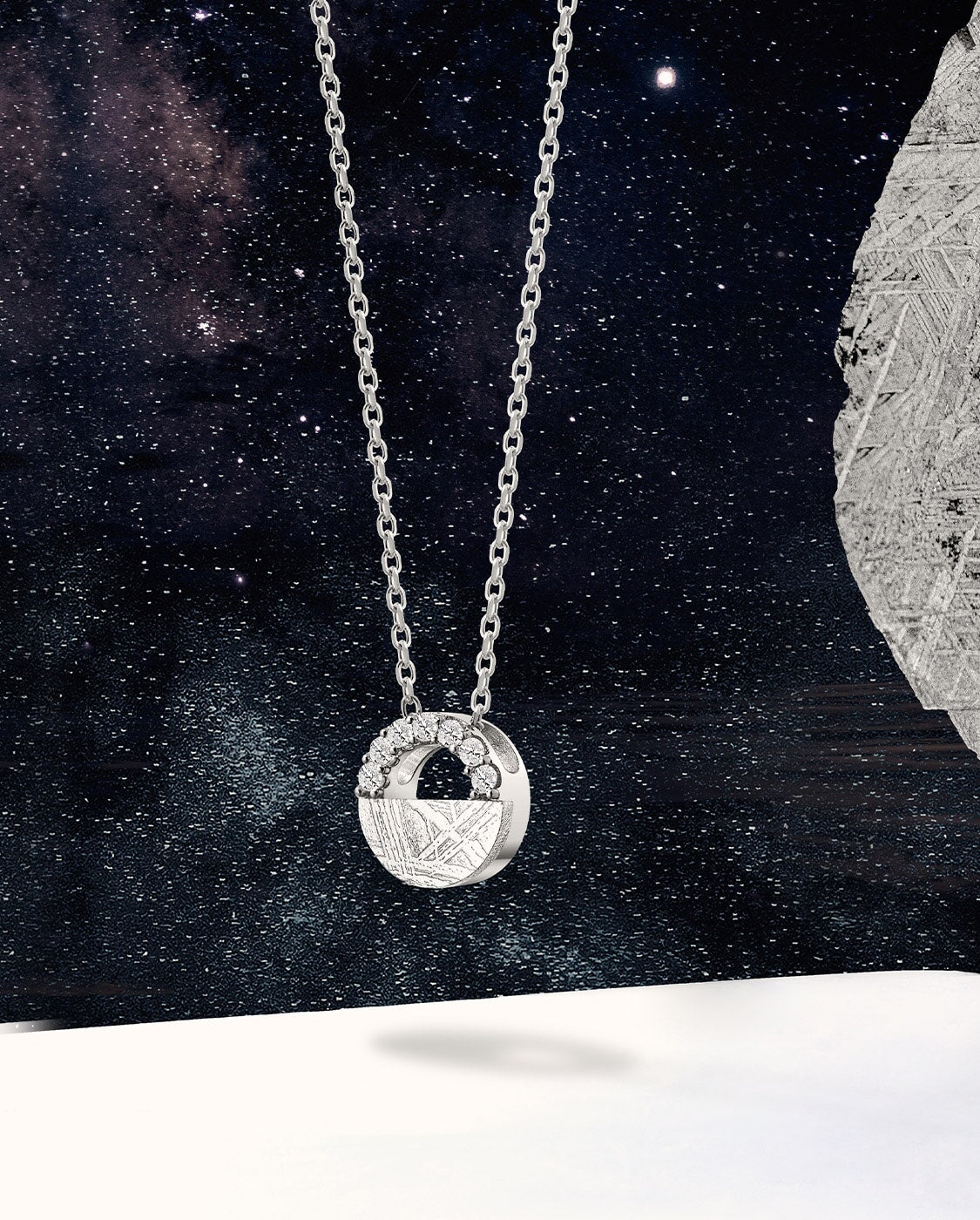 This necklace is designed to capture the beautiful moment when the Muonionalusta meteorite landed on Earth a million years ago—commemorating the moment for posterity.