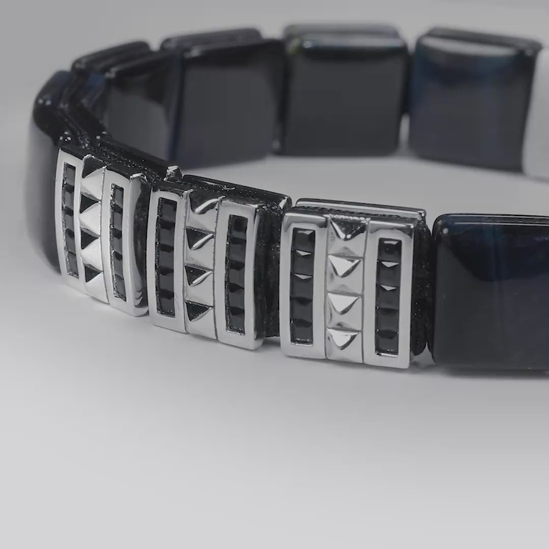 Hawk Eye—also known as Blue Tiger's Eye—displays a chatoyant shimmer across deep navy and grey tones. The effect shifts with movement and light angle, a result of fibrous mineral structure formed over geological time. Each 9.5mm square bead captures this subtle lustre.