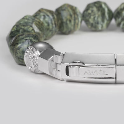 Crafted from sterling silver and featuring South African green zebra jasper, this beaded chain bracelet from AWNL's classic half chain collection epitomizes luxury. Antique, unique dragon eye opal beads lends an oriental zen ambiance to the gleaming metal, while the thick duck-tongue spring clasp provides an effortless on and off experience. Seamlessly blending high class and premium quality, this bracelet is certain to make a statement.