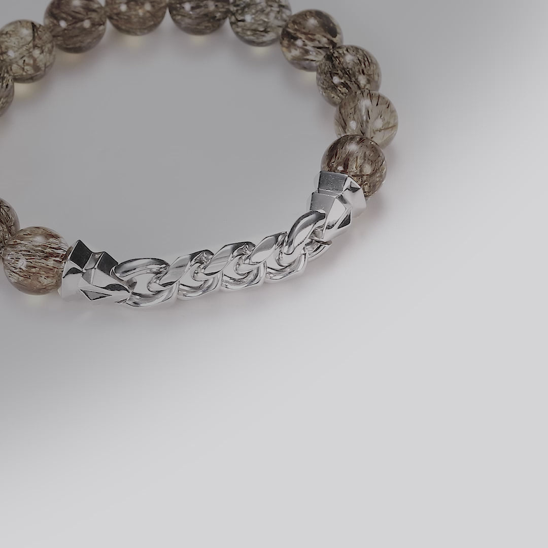 More than a hybrid design, it is a study in contrasts: silver links suggest tailored refinement, while the elastic-mounted stones move with primal ease. This dual character feels as natural in the boardroom as it does on weekend adventures.