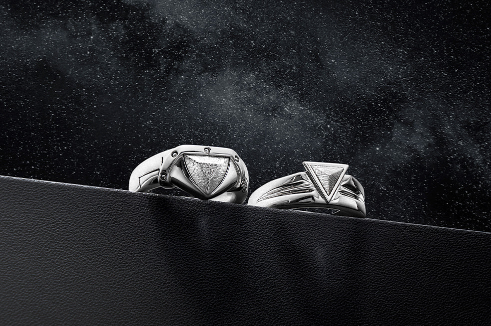 Meticulously crafted from silver and the rare Muonionalusta meteorite, these men's jewelry invites you to wear the universe, embodying the boundless spirit of the cosmos and the timeless allure of minimalist style.