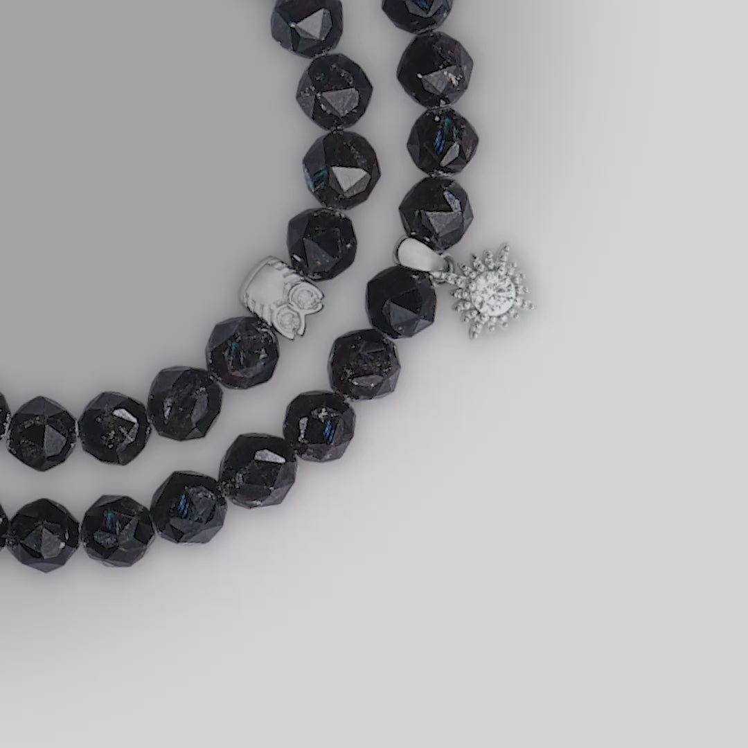 Unique 3 billion year old Nuummite stones handcrafted into a stylish double wrap bracelet. Premium 84 faceted star cut round beads showcase the stone's energy connection. Charming owl, four-leaf clover, and pointed stars bring luck to the wearer. Silver lobster firm clasp with extender chain for easy adjusting. A perfect accessory for luck & relationships.